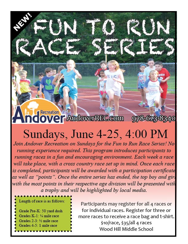Join Andover Recreation on Sundays for the Fun to Run Race Series! No running experience required. This program introduces participants to running races in a fun and encouraging environment. Each week a race will take place, with a cross country race set up in mind. Once each race is completed, participants will be awarded with a participation certificate as well as “points”. Once the entire series has ended, the top boy and girl with the most points in their respective age division will be presented with a trophy and will be highlighted by local media.