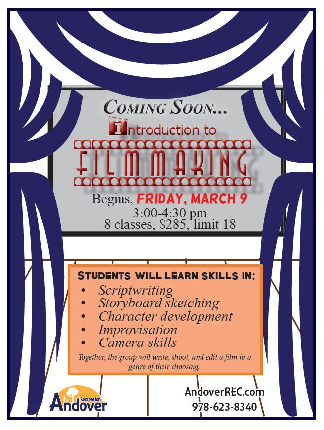 Andover Recreation's newest hit is Introduction to Filmmaking! In this program, students can bring their creative ideas to fruition in a fun, collaborative and exiting environment. Students will learn skills in script writing, storyboard sketching, character development, improvisation, and camera skills. Together, the group will write, shoot, and edit a film in a genre of their choosing by using software like Final Cut Pro. All films will also be made eligible to be screened at the Boston International Kids Film Festival at the Somerville Theater in June 2018.
