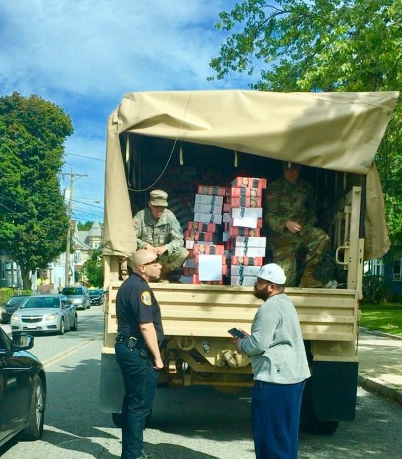 Lawrence Police Officer Gary Yancey with the National Guard handing out hot plates on Salem Street to residents. Photo by Lawrence Police.