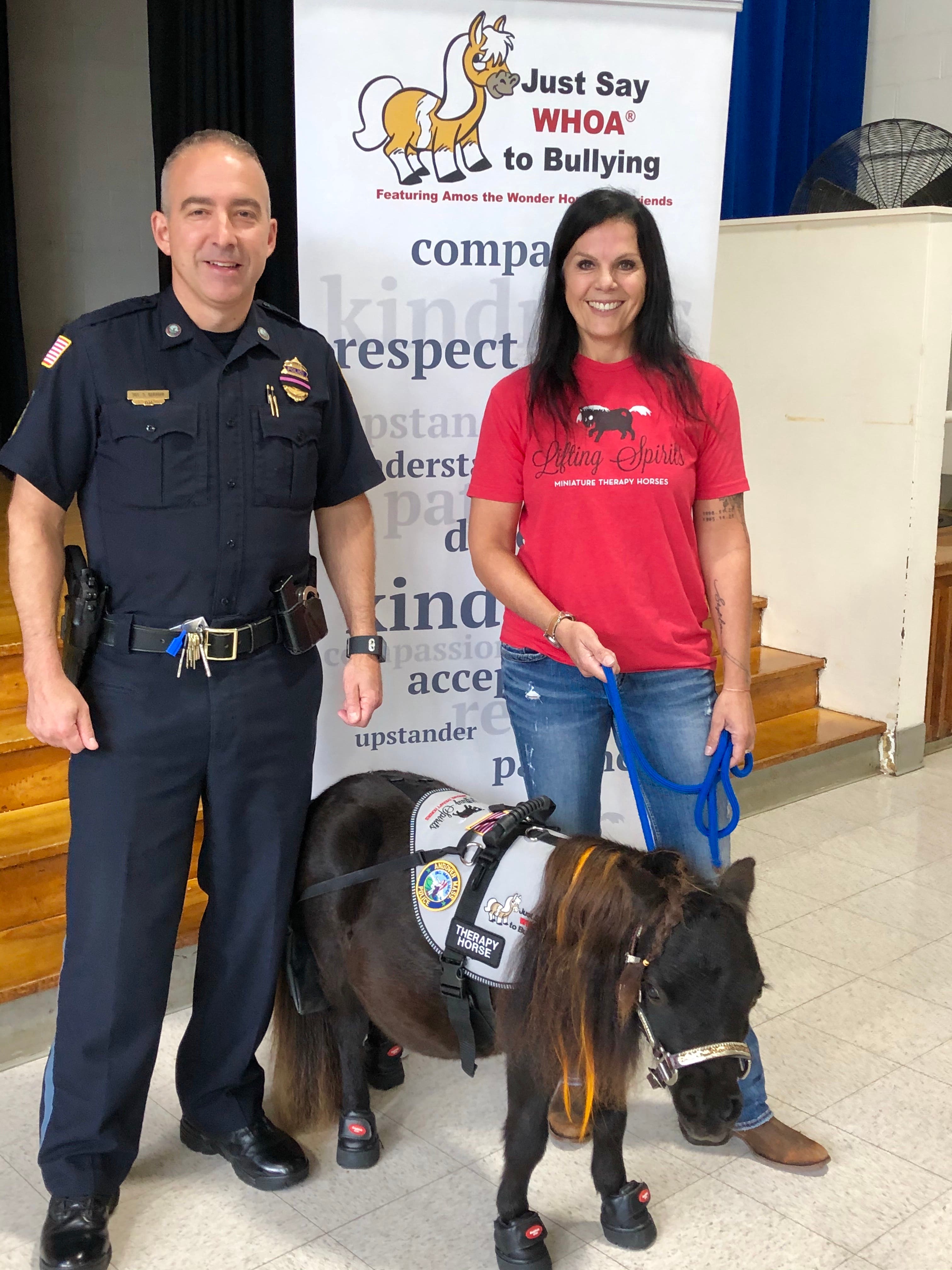 Hadad, who founded Lifting Spirits Miniature Therapy Horses in Andover, arranged to join the national "Say WHOA To Bullying" program, brought in the local police departments, and began working with local schools this year. She goes to elementary schools, with a police officer, and they do a presentation on bullying, using her miniature horse as an example. According to Hadad, her involvement is partly inspired by personal experience.