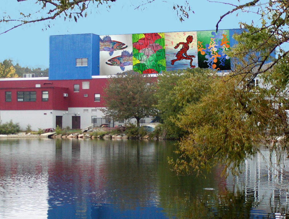 Student artwork for the mural was chosen specifically to highlight the artistic talents of our youth and to engage the community in supporting youthful creativity. Rather than choose an image by a professional artist, APA felt that youth-generated imagery would be more easily supported by residents. Images generated by young people, many who have fond childhood memories of Spy Pond and the Arlington Boys and Girls Club, seemed especially appropriate for the setting. The eye catching, colorful mural covering the large blue wall next to Spy Pond, will enliven the view from the bike path, Spy Pond, and surrounding homes, and attract visitors to Arlington.