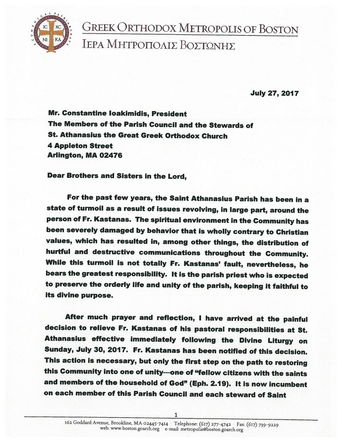 “For the past few years, the Saint Athanasius Parish has been in a state of turmoil as a result of issues revolving, in large part, around the person of Fr. Kastanas,” reads a letter posted to the parish's website.