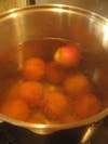 At the same time, fill a smaller pot with water and bring to a boil. Set up a bowl with ice water and the jam cooking pot nearby. Use a sharp knife to score the bottom of each peach with an x. When the water is boiling, drop in peaches. After about 1 minute, you will see the skin start to peel away from the fruit. Remove the peaches and place in the ice water bath. When the peaches are cool enough to handle (about 30 seconds), the skin should peel right off. Cut the peaches in 4 pieces directly into the cooking pot. Repeat the process as needed until all peaches are skinned and cut.
