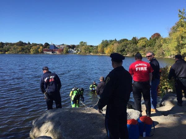 ARLINGTON, MA — Bystanders rushed into the cold October waters of Spy Pond in Arlington Friday afternoon to save a woman from a vehicle that was accidentally driven into the water.