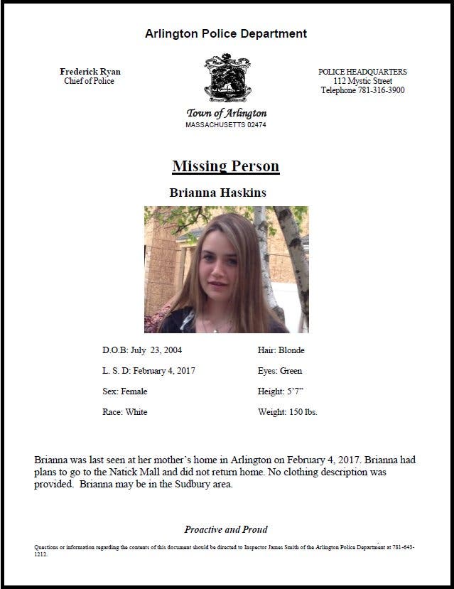 Brianna Haskins was last seen at her mother's home in Arlington on Saturday, Feb. 4. She had plans to go to the Natick Mall but did not return.