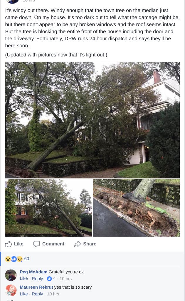 "It was a 60 foot tree, and the way it came down it missed the power lines, missed the windows, and ended up just resting on the house. [Arlington Police] and DPW personnel got here within 5 minutes of my call, a very impressive response time," Matt Landau posted to social media in the wee hours Monday morning.
