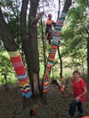 The biggest challenge to the project was getting the feet and feet of yarn up and around the trees some 20 feet in the air.