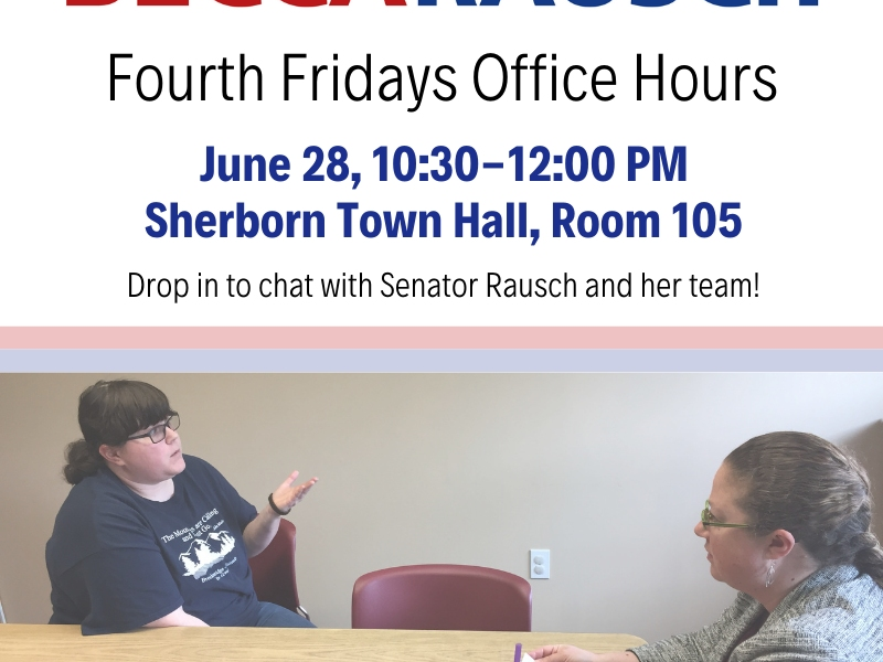Senator Rausch (D-Needham) will host her next “Fourth Fridays” office hours on Friday, June 28, 10:30 a.m. - 12:00 p.m. in room 105 at Sherborn Town Hall (link here). During these office hours, held on the fourth Friday of every month, residents from any part of the Norfolk, Bristol and Middlesex District are welcome to meet Senator Rausch and her staff and share their questions and opinions on state issues.
