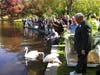 The swans were released just after a short parade, that included a brass band, from the corner of Charles and Boylston streets to the Boylston side of the lagoon.