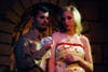 Another impressive addition by set designer Evan Haussman was a working fountain in the “gardens of Cypress.” Of course, the fountain runs only for a portion of the show; the director explains that running water elicits a certain physical response among actors and audience members! Lighting, too, by David Fenn, was well done, particularly in a scene during which Iago, now truly demonic, stands behind Othello in a red spotlight and convinces her to murder her lover.