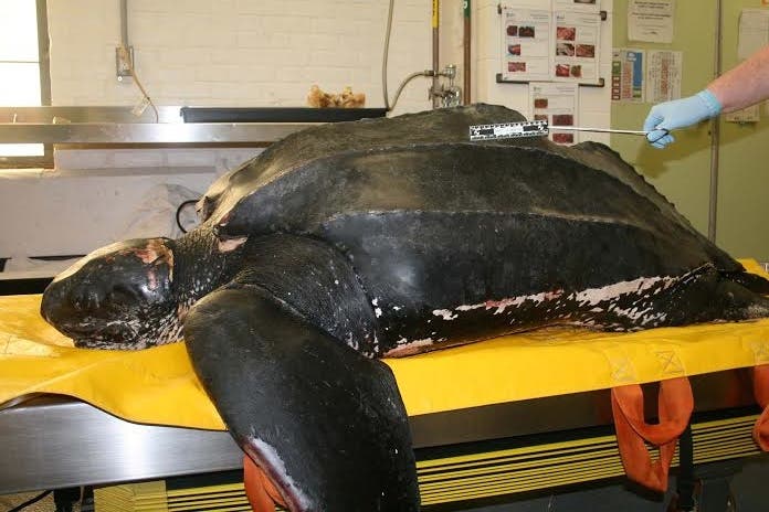 The 400-pound leatherback turtle washed up on Sandy Neck Beach Sunday and was transported to the aquarium’s sea turtle hospital in Quincy for a necropsy. The findings were depressing.