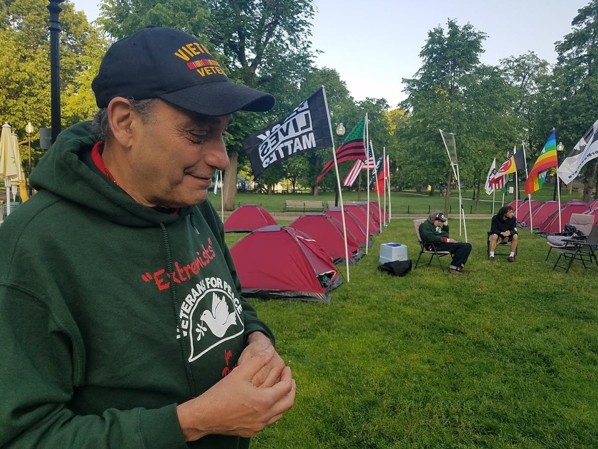 "The particular message we're trying to get across here is 53 cents out of every dollar in the discretionary budget is spent on the military; while we have homeless military veterans; while we have people in need in this country. You can walk across the street and it's full of homeless people. There's a war on the poor," said Vietnam Veteran Dan Luker, the one who organized the tents and is considered the Boston group's fearless leader.