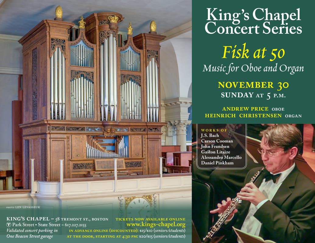 The King’s Chapel Concert Series concludes the 50th anniversary celebrations of its renowned Fisk organ. Oboist Andrew Price joins organist and Music Director Heinrich Christensen for a program featuring music for organ and oboe. Also featured will be the world premiere of a solo organ work by Carson Cooman. Mr. Price, who makes his solo debut at King’s Chapel, is principal oboist for the Boston Pops Esplanade Orchestra and regularly plays with the Boston Pops Orchestra and the Boston Symphony Orchestra. He has recently joined the faculty of Boston University School of Music as a Lecturer of oboe.