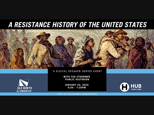 BOSTON – Join Old North Illuminated for a thought-provoking online conversation with public historian Tad Stoermer examining the role of resistance in shaping American history. Set for Thursday, January 22, from 6 to 7:30 p.m., Stoermer will draw from his forthcoming book, A Resistance History of the United States, in which he challenges familiar stories of the American past, arguing that the nation was shaped not by shared liberty, but by ongoing struggles between resistance and power. Through key moments such as Bacon’s Rebellion and Metacomet’s War, the Salem Witch Trials, and the Underground Railroad, he explores how resistance movements exposed the limits of freedom and pushed back against systems of oppression. These stories reveal how myths, selective memory, and institutional silence have long protected abusive power—and what we can learn from past resistance as we confront injustice today. The program is part of Old North Illuminated’s ongoing commitment to public history and community dialogue. This virtual event is accessible with a donation of any amount to support Old North Illuminated, the nonprofit that stewards Old North Church Historic Site. The 2026 Speaker Series is brought to you in part by HUB Town Tours. To register, please visit: https://www.oldnorth.com/events/.