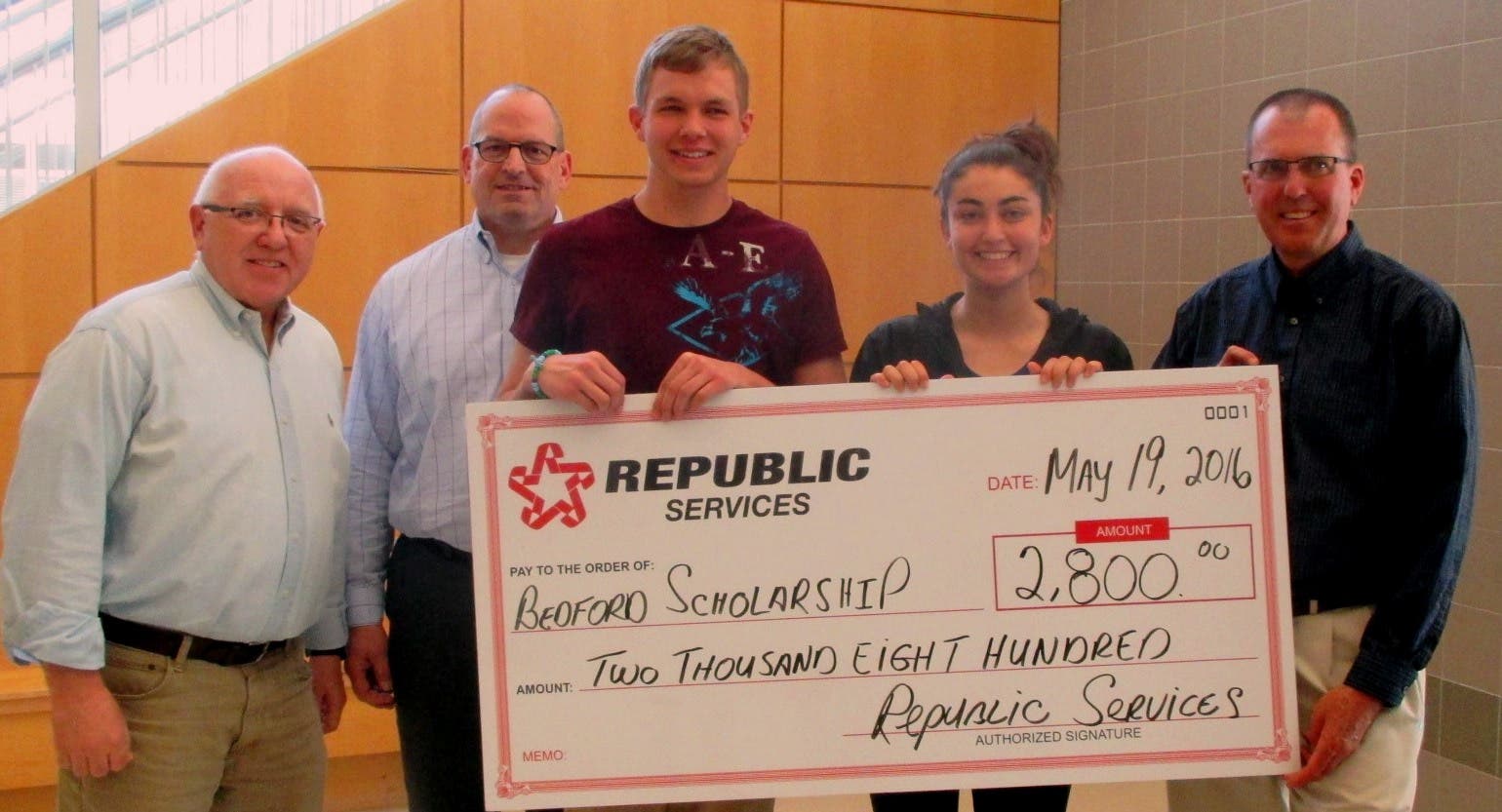 Photo (left to right): Bedford Recycling Coordinator Ed McGrath, Republic Services General Manager Chris Peters, scholarship award recipients Trenton Sanders (center) and Avery Kaplan, and Program Administrator for Science Michael Griffin.