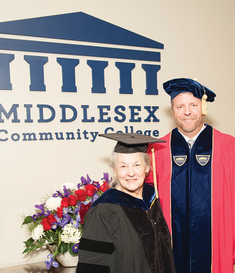 PHOTO CAPTION: Middlesex Community College alum Robert Kenyon (right), Biogen’s Vice President of North American Manufacturing Operations, praised Dr. Mariluci Bladon (left), founder and coordinator of MCC’s Biotechnology Program, during his commencement address to the Class of 2017. MCC is moving ahead with plans to build a state-of-the-art biotechnology facility on the Lowell campus.