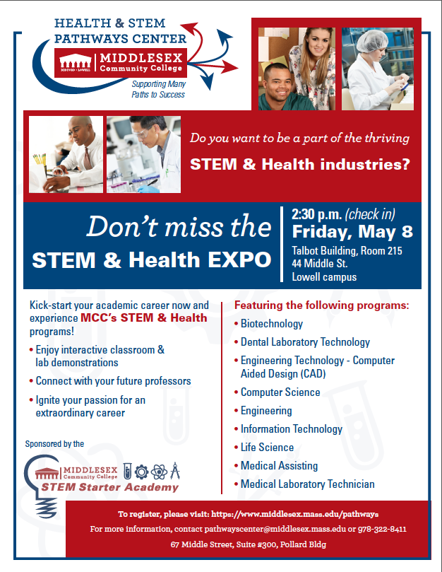 To register for MCC’s STEM & Health Expo, visit https://www.middlesex.mass.edu/pathwayscenter/stemexpo.aspx