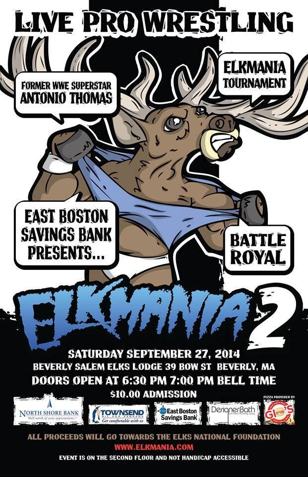-ElkMania, in association with Project Zero Wrestling, is a Massachusetts based professional wrestling promotion. Its operations are based in Beverly and Salem Massachusetts. ElkMania is dedicated to providing quality family entertainment for a good cause. Unfortunately, the Beverly/Salem Elks is not handicapped accessible. For more information regarding this event, please visit http://www.elkmania.com and to learn more about the Elks National Foundation, visit http://www.elks.org/enf
