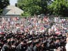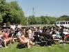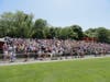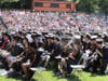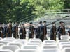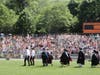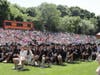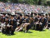 The ceremony was held under bright sunny skies and sweltering hear at Hurd Stadium, where graduates sat on folding chairs on the lush grass of the field - each cap decorated with everything from a collage of photos from the high school years to a celebration of the college they will be attending.