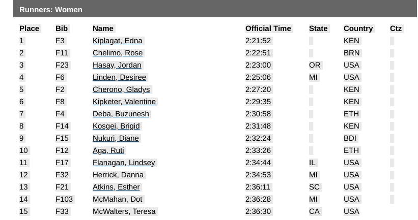 Last year's top 15 Boston Marathon finishers: