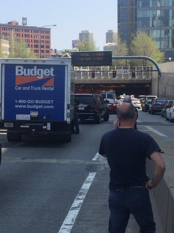 #MAtraffic Rt 93SB X20 #Boston shut down for truck fire in the O'Neil Tunnel. All traffic being diverted off X26 #Leveritt/Storrow Dr.