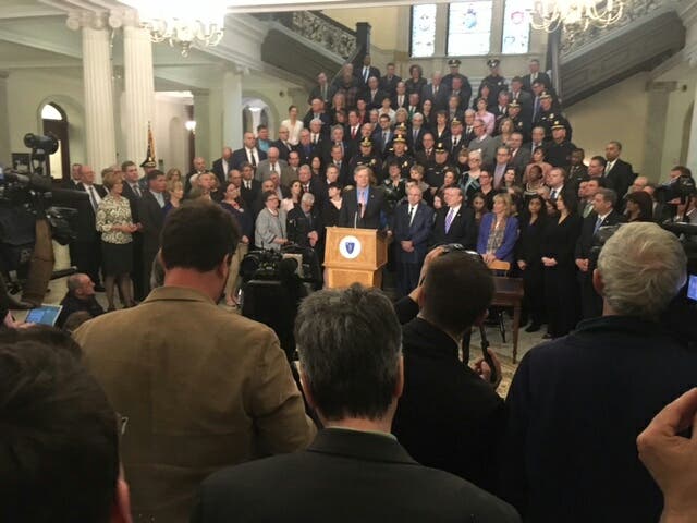 BOSTON, MA - Flanked by sheriffs, lawmakers, advocates, healthcare providers and substance abuse survivors, Gov. Charlie Baker signed into law a bill intended to stem the tide of opioid abuse in Massachusetts.