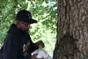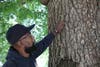 BOSTON, MA — At first you might think he is hugging the large tree on the Boston Common closest to the State House, or perhaps measuring it. Then it might look like he's picking something from the bark. As it turns out, he is pushing peanuts into the crevices of the tree.