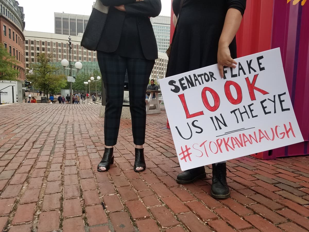 BOSTON — Addressing hundreds of people Monday at City Hall Plaza, Sen. Jeff Flake of Arizona said he found Dr. Christine Blasey Ford's testimony "credible" but didn't like Judge Brett Kavanaugh's partisan tone during a hearing last week before the Senate Judiciary Committee.