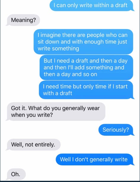 Hilary Sargent, who started the acclaimed Chartgirl website and no longer works for the Globe, posted a screen grab of a partial text message exchange in which she appears to be asking for writing advice from an unnamed person. That person, who she says is Brian McGrory, responds with a question about what she's wearing when she writes.