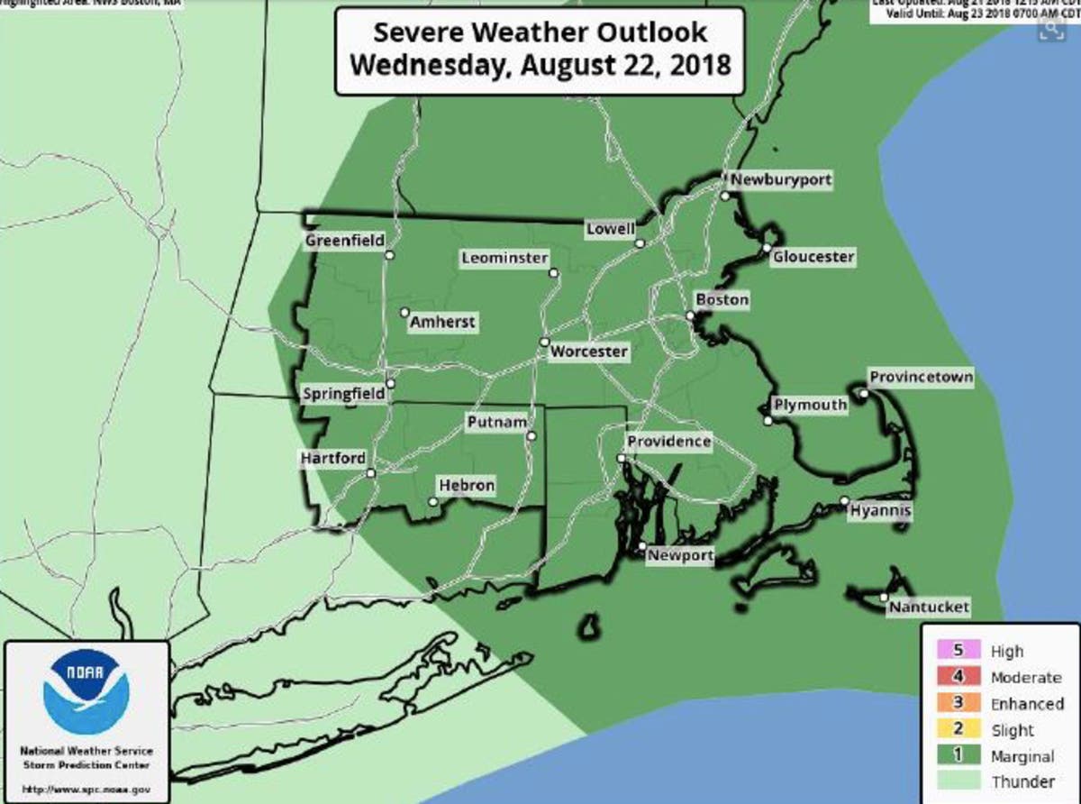 Two potentially serious storms are expected to hit Massachusetts over the next 36 hours. Forecasters are warning of the possibility of a "short-lived tornado" Wednesday morning, followed by damaging winds later throughout the day. The whole state is under a hazardous weather outlook.