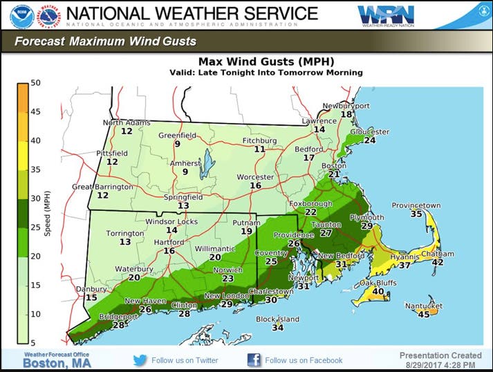 Still, the storm making its way up the coast is no joke. Fortunately it's far out enough where interior Massachusetts should just have to deal with strong winds and potentially some minor overnight rain. The waters off the Cape, however, are under a storm warning with 50+ miles per hour winds and waves of up to 10 feet possible, the National Weather Service said. The coast from up to New Hampshire is under a small craft advisory.