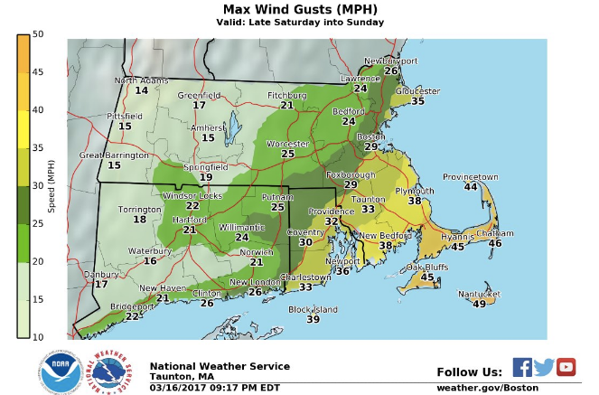 - Strong winds are possible near the coast, especially in southeast New England, including Cape Cod, Martha's Vineyard and Nantucket Island, as well as parts of Long Island. These winds will likely persist into Sunday night in southeast New England.