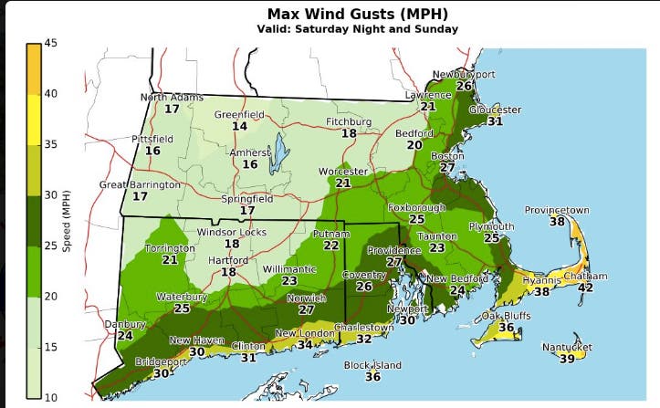 It won't be a warm or calm rain. Highs will be in the 40s on Sunday and wind gusts of up to 40 miles per hour are possible, particularly closer to the Cape and coast.