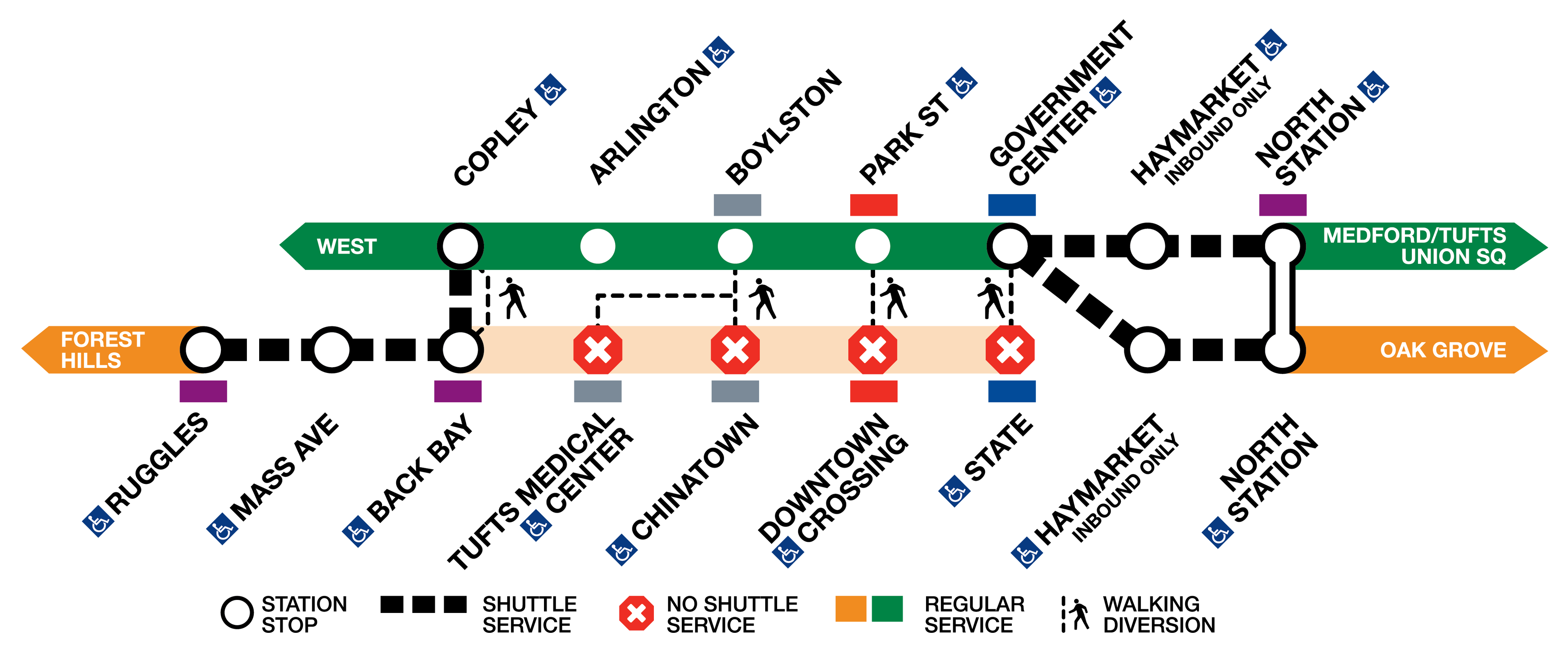 But the Green Line will also have a disruption, with trains skipping stops between North Station and Government Center. At that point, the shuttle will also take Orange Line riders to Oak Grove in Malden.