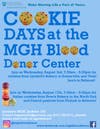 · On August 3rd and again on August 17th the MGH Blood Donor Center will be hosting Cookie Days! Lyndell’s Bakery in Somerville and Vicki Lee’s from Belmont will be providing delicious cookies for donors to sample on August 3rd. Donors visiting the center on August 17th will be treated to French pastries from Praline in Belmont and Italian cookies from the famous Bova’s Bakery in the North End