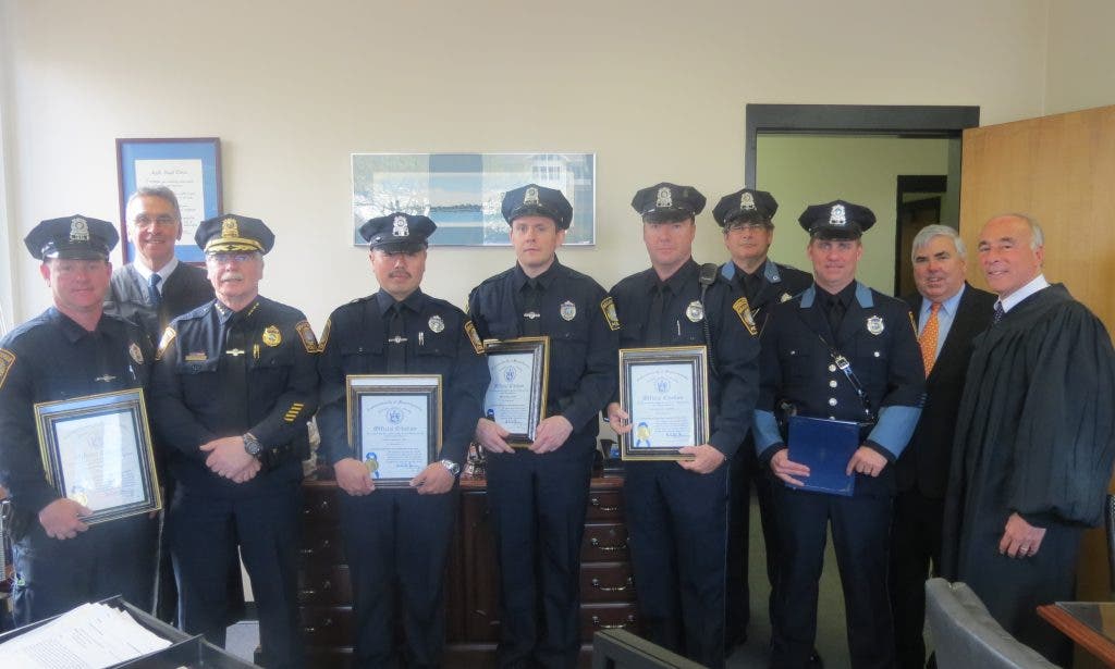 Norfolk District Attorney Michael W. Morrissey has recognized four Braintree Police Officers with 2013 Officer Robert P. Dana Awards for outstanding policing. Chief Russell Jenkins nominated officers involved in two separate incidents for the prestigious recognition.