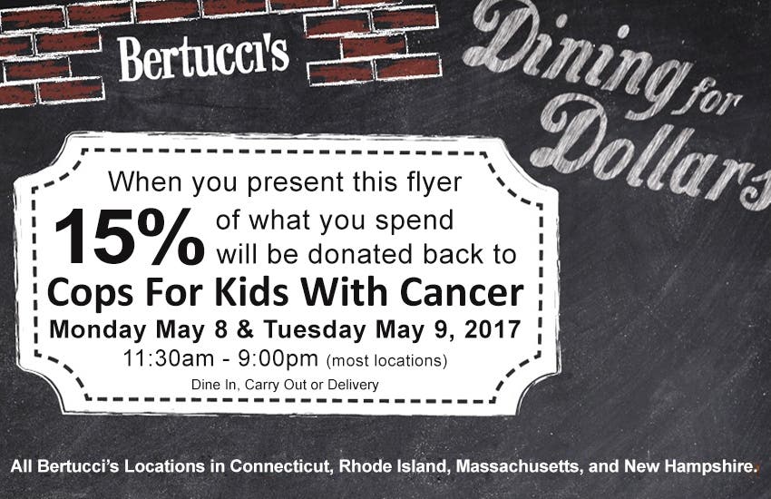 On Monday, May 8, and Tuesday, May 9, Bertucci's restaurant in Massachusetts - including the South Brookline location -will donate 15 percent of those days' proceeds to Cops For Kids With Cancer. The donated percentage applies to dine-in, carry out and delivery proceeds.