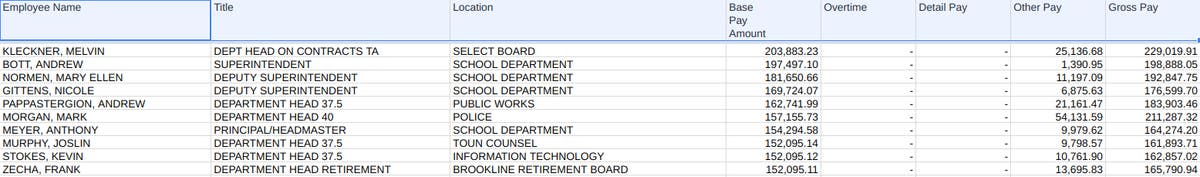 Otherwise, the town's payroll for 2018 showed that, similarly to the year before, the top paid employees for the town and schools included the town administrator, the superintendent of schools, a couple of deputy superintendents and the head of the Department of Public Works. The police and fire chiefs didn't make the top 10, most likely because they're still the new kids in town, both having been hired partway through the year.