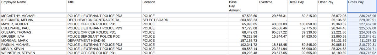 When it came to the highest earners after detail work (mostly paid by third-party contractors) and educational bonuses, several police officers were among the highest earners. All 10 were men.
