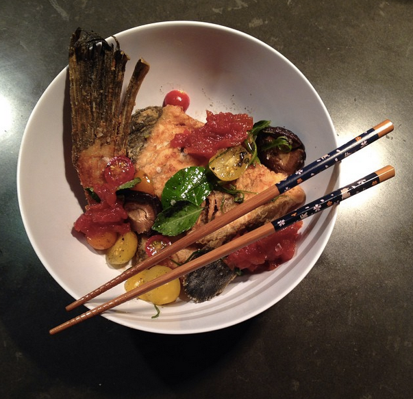 Photo: Fried fish bones, mentsuyu, shiitake, and tomato at Ribelle. (Credit: Ribelle via Instagram)