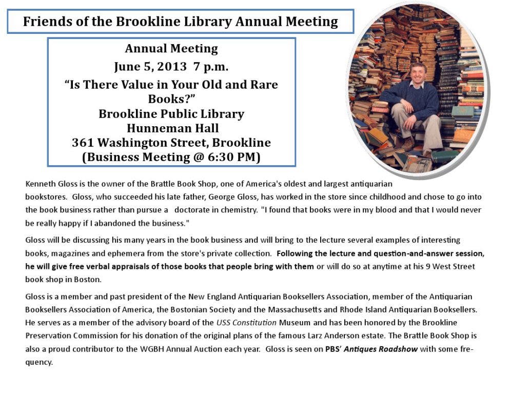Gloss will be discussing his many years in the book business and will bring to the lecture several examples of interesting books, magazines and ephemera from the store's private collection. Following the lecture and question-and-answer session, he will give free verbal appraisals of those books that people bring with them or will do so at anytime at his 9 West Street book shop in Boston.
