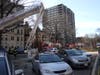 Many police and fire crews are still on scene at the Beacon Street apartment building where a four-alarm blaze broke out this morning. Brookline DPW crews are also on scene sweeping up debris and sand that was spread out through the area.