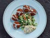 Schawarma is fast food, street food, meant to be eaten with the hands and a warm circle of pita or lavash. What’s vital to good schawarma—in addition to flavor, of course, which here is a spice blend strong on nutmeg and allspice—is texture. The meat should be moist and tender inside, but with a savory outer crust, similar to the smaller, slightly blackened end of the roast that’s such a delight to chew on. French fries are a conventional side in Israel; that’s all the better to soak up the juice with, but here, with this slightly dry turkey schawarma, I loved a side of wonderfully seasoned grilled vegetables.