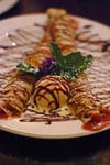 The dessert menu offers intriguing choices like apple “schtrudel” to Cherry Vareniki, homemade dumplings with a cherry- and whipped-cream finish. We chose fruit blintzes ($6), filled with apples, bananas, and strawberries sauteed in red wine, and then indulged in blintzes with warm chocolate mousse ($7), which spilled a river of incredible warm chocolate onto the plate as we forked into it.