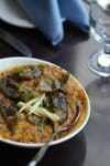 Even some of the cocktails from the full bar are meant to complement and refresh; a lychee martini that was stiff and acerbic on its own shone alongside the strong palate of spice in the curries. This well-crafted menu, delighting in bold flavors from the Southern Indian coast, is intriguing that way.
