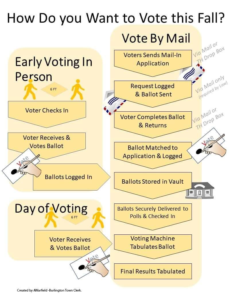 Town Clerk Amy Warfield created a graphic explaining the three ways to vote in this fall's elections.