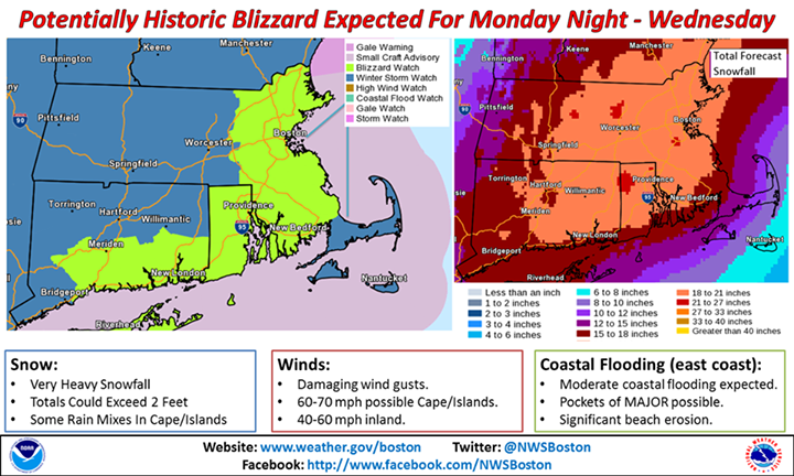 The National Weather Service is predicting a “potentially historic blizzard” to hit Massachusetts starting on Monday night and stretching into Wednesday.