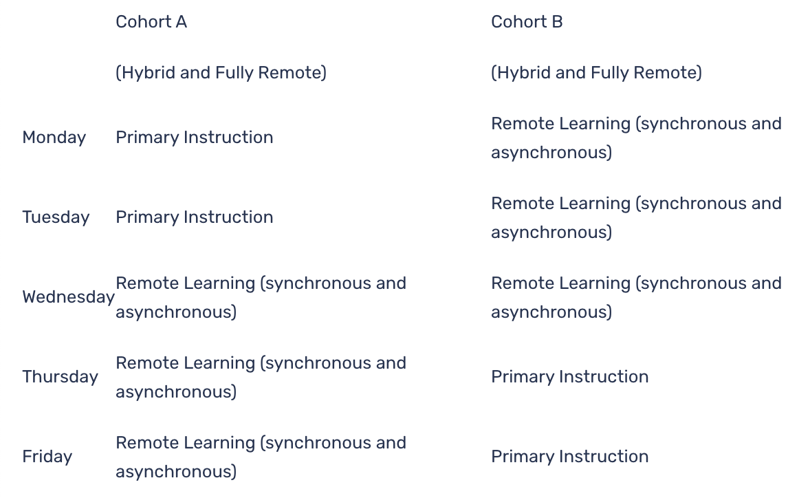 This year's schedule for students includes two cohorts, both hybrid and fully remote, which follow synchronous and asynchronous instruction. Virtual homeroom takes place at 7:45 a.m. on remote learning days, followed by a live stream of morning announcements.