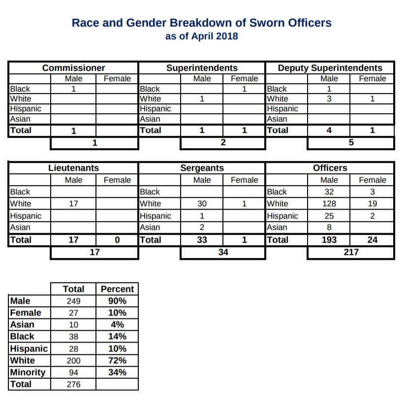 Although all five of the promotions were men, prior to the promotions of the 276 police officers on the force, 27 of them (or about 10 percent) were women, including one with the rank of sergeant, one with the rank of deputy superintendent and one with the rank of superintendent.