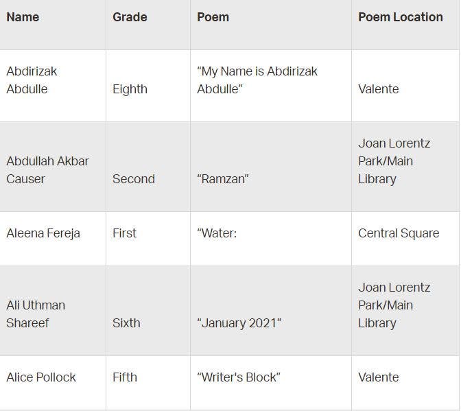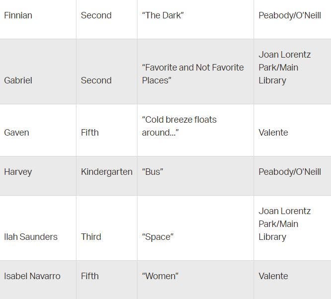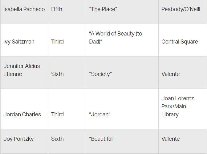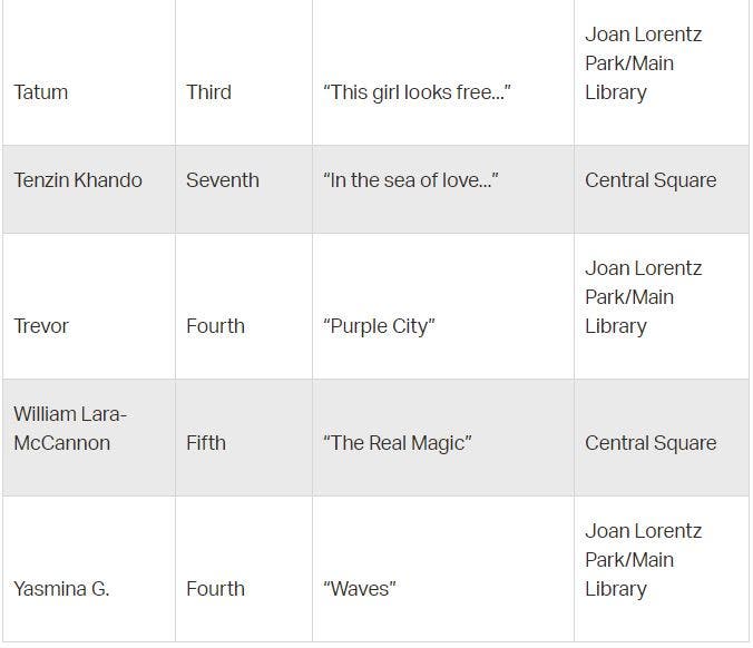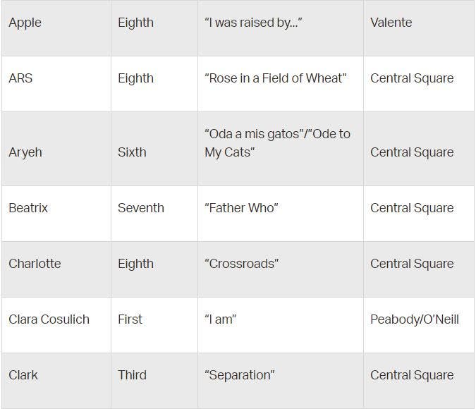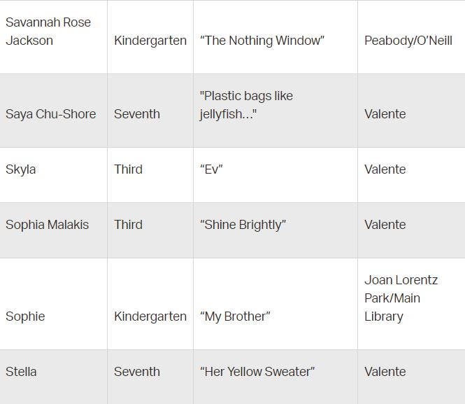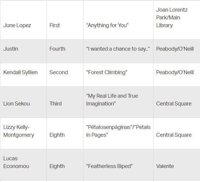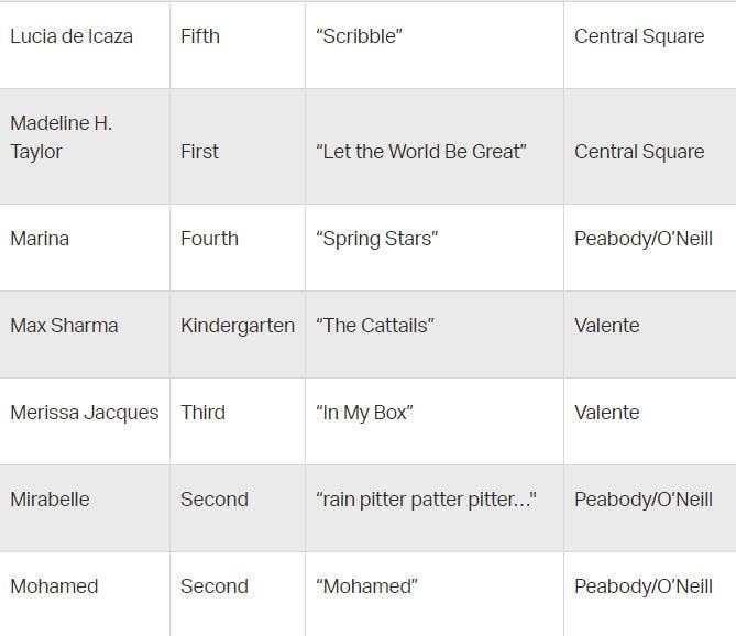 Each year, the Cambridge Public Library hosts a poetry contest for students in grades K-8 who live or attend school in Cambridge. We are delighted to announce the winners of this year's awards below. This year, instead of our customary awards ceremony and reading, we are sharing the students' poems with the Cambridge community by posting them at four locations around the city: